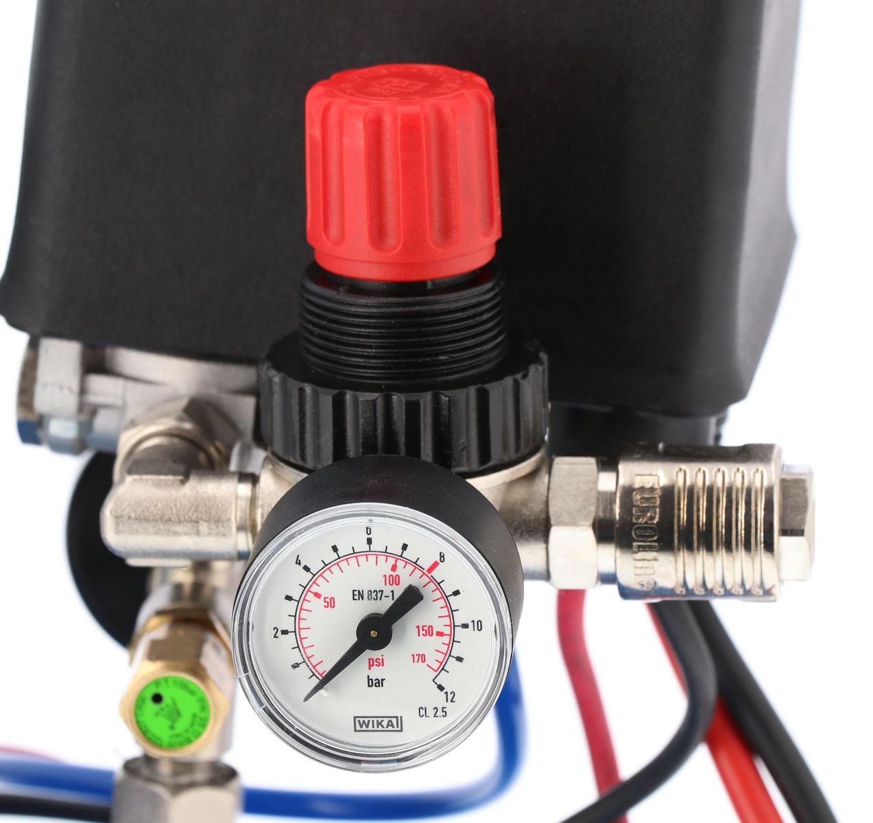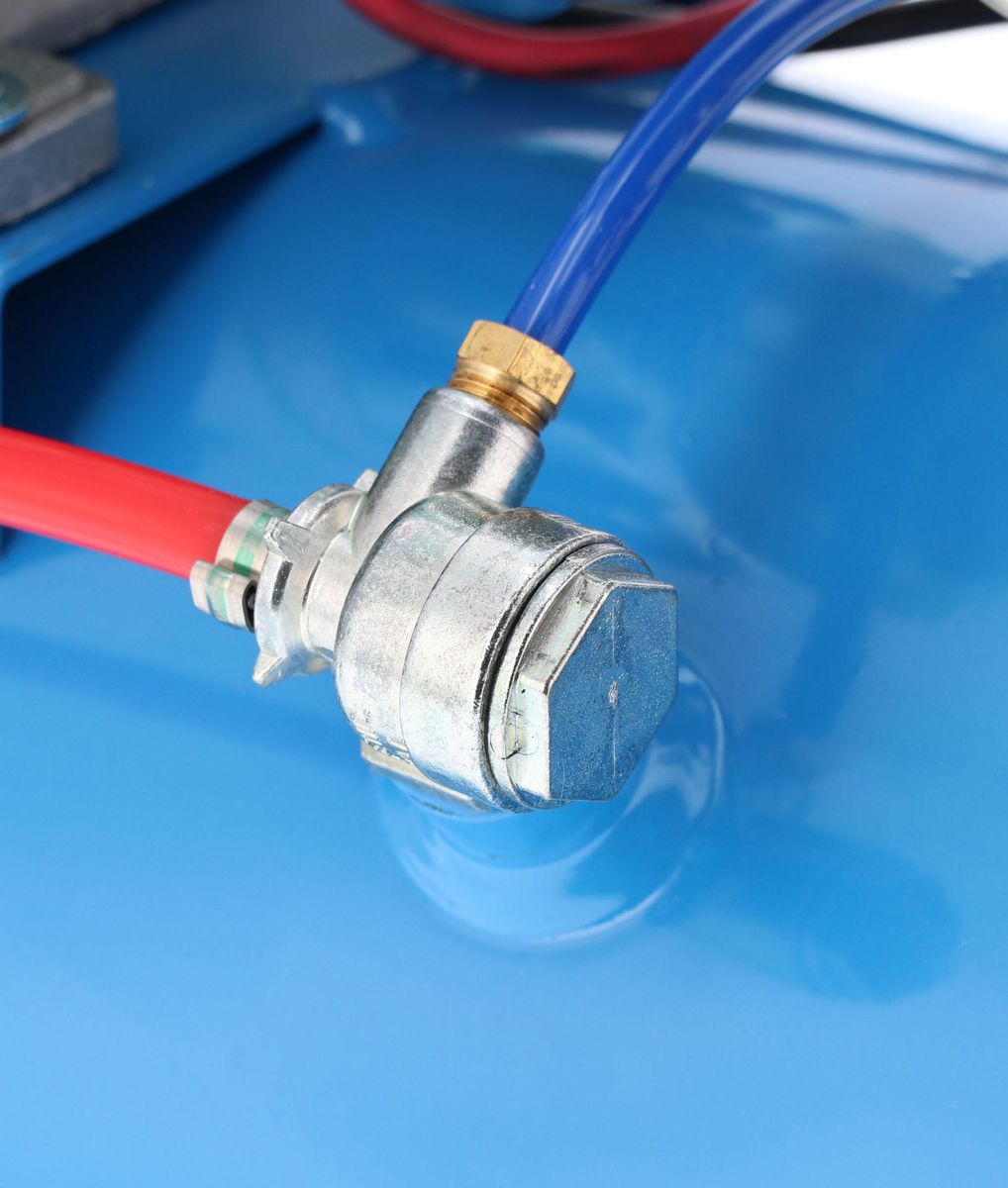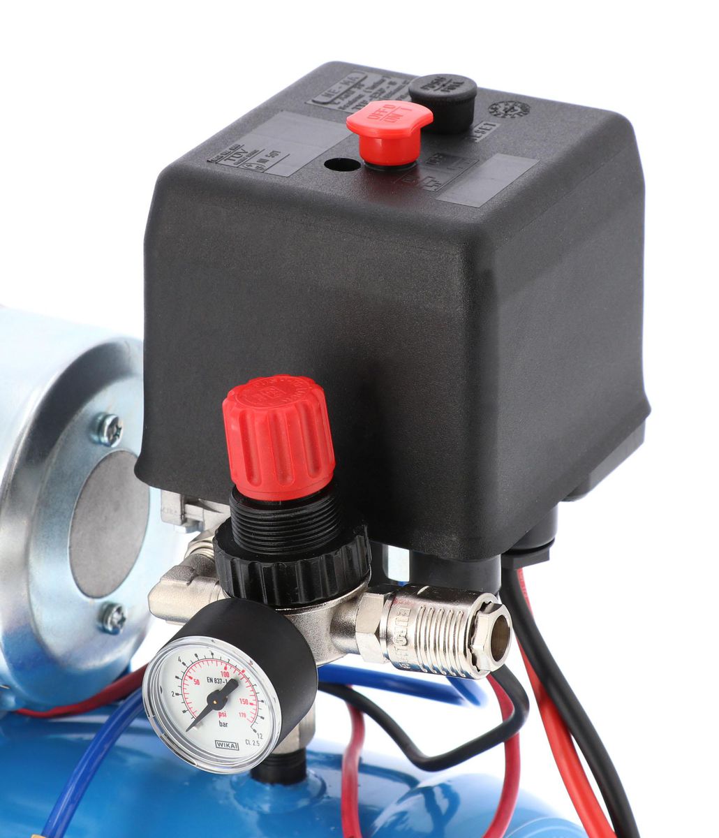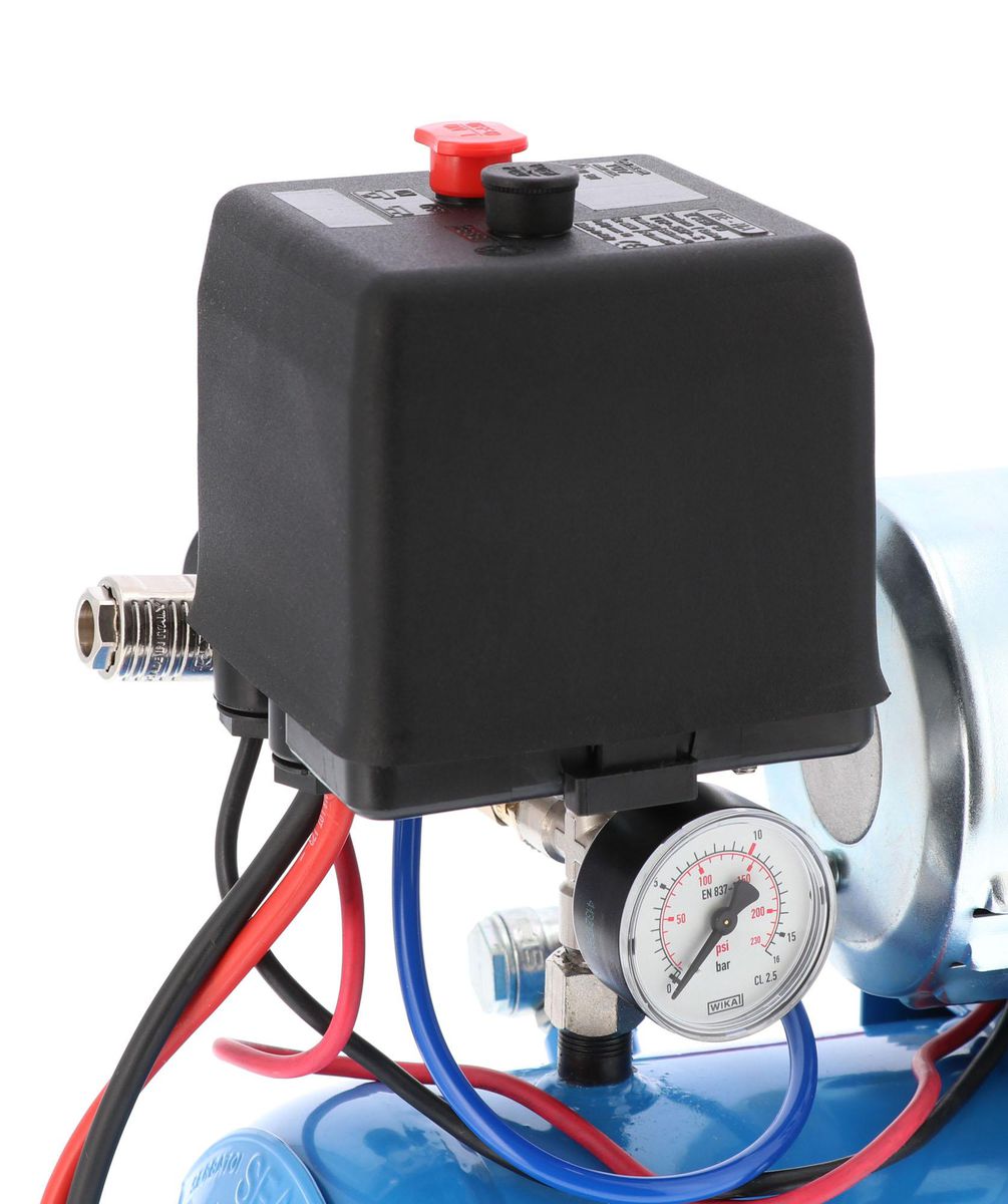 - Wyposażony w tłumik hałasu, manometry, szybkozłącze pneumatyczne oraz reduktor ciśnienia.