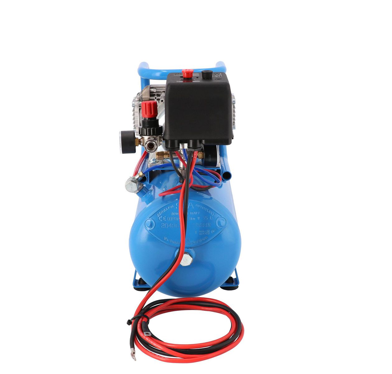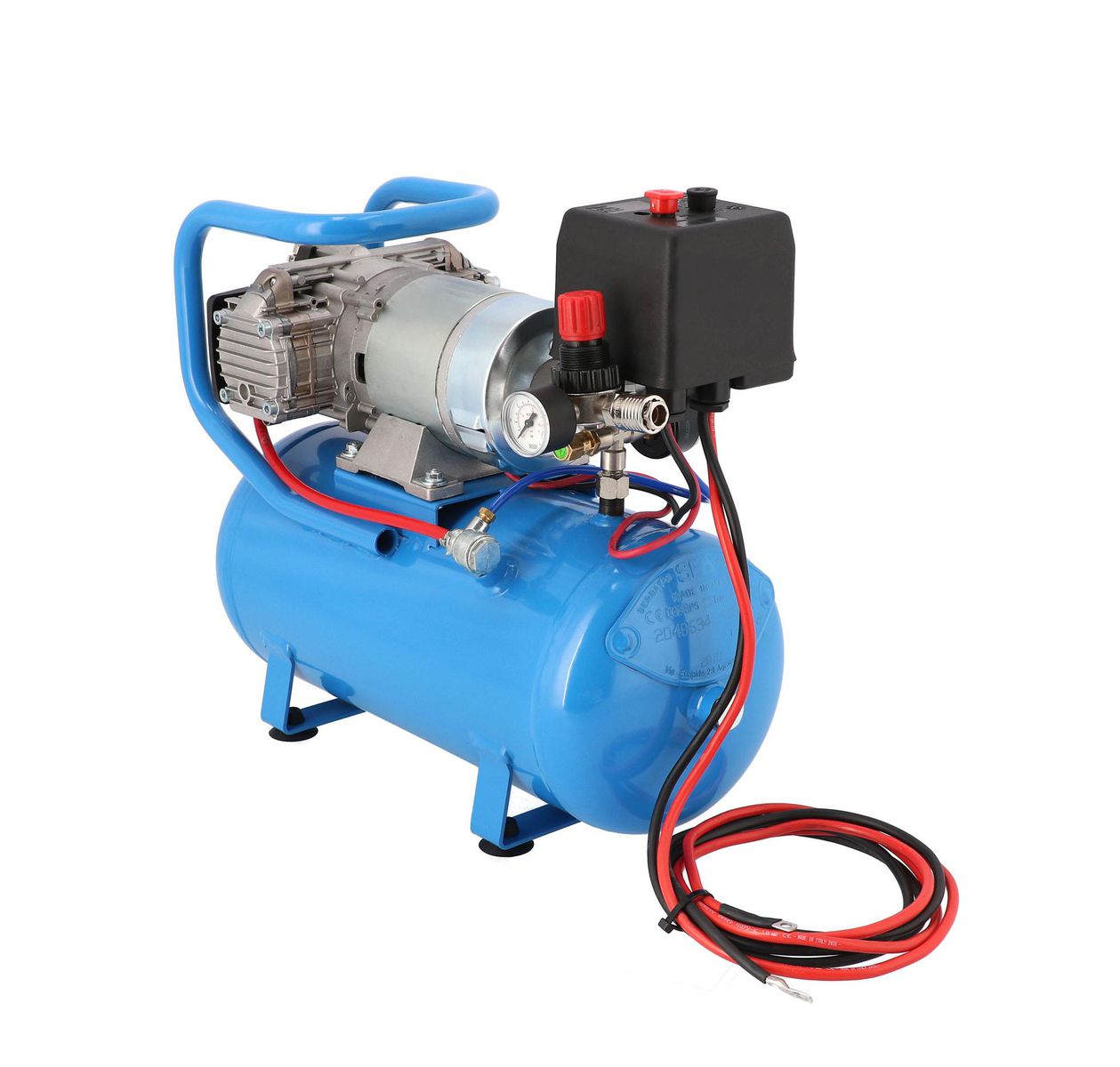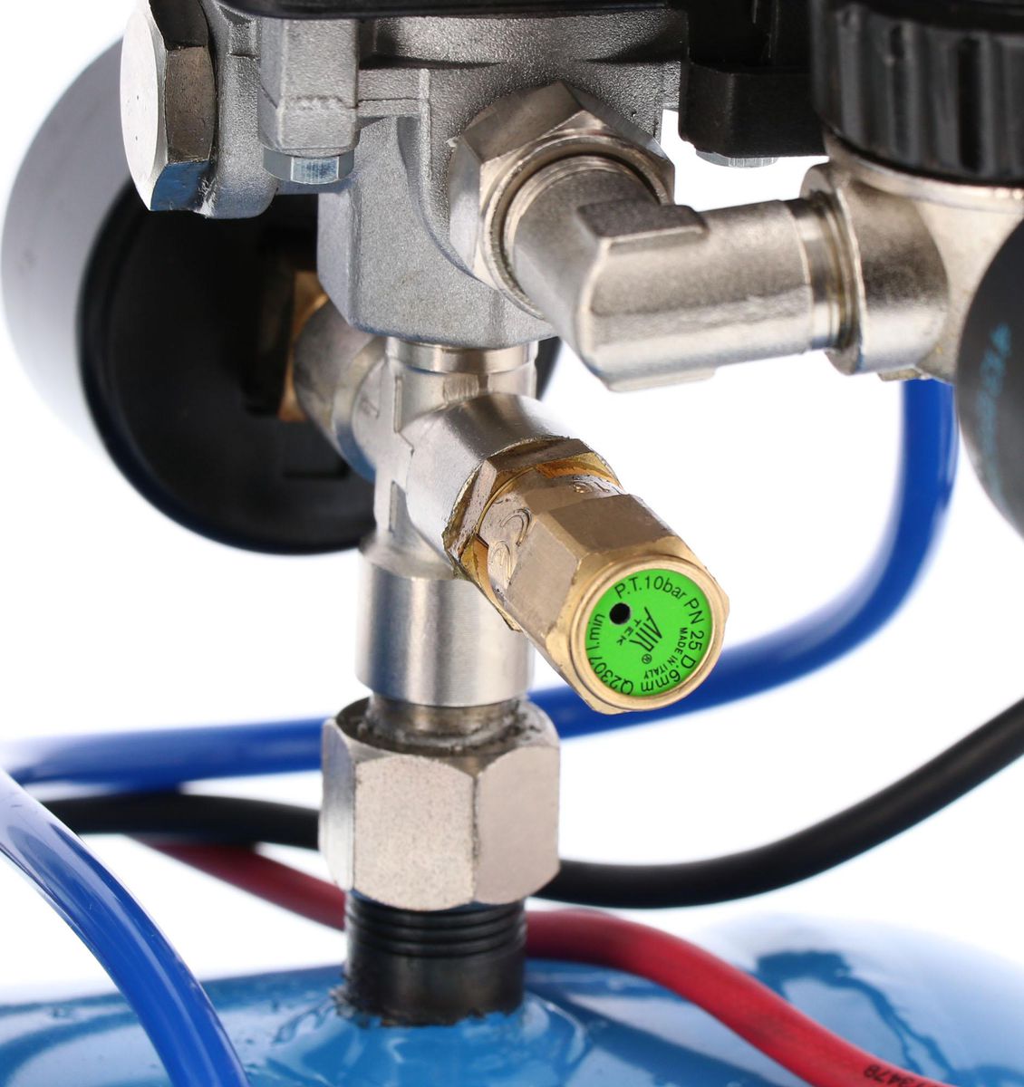 - Wyposażony w tłumik hałasu, manometry, szybkozłącze pneumatyczne oraz reduktor ciśnienia.