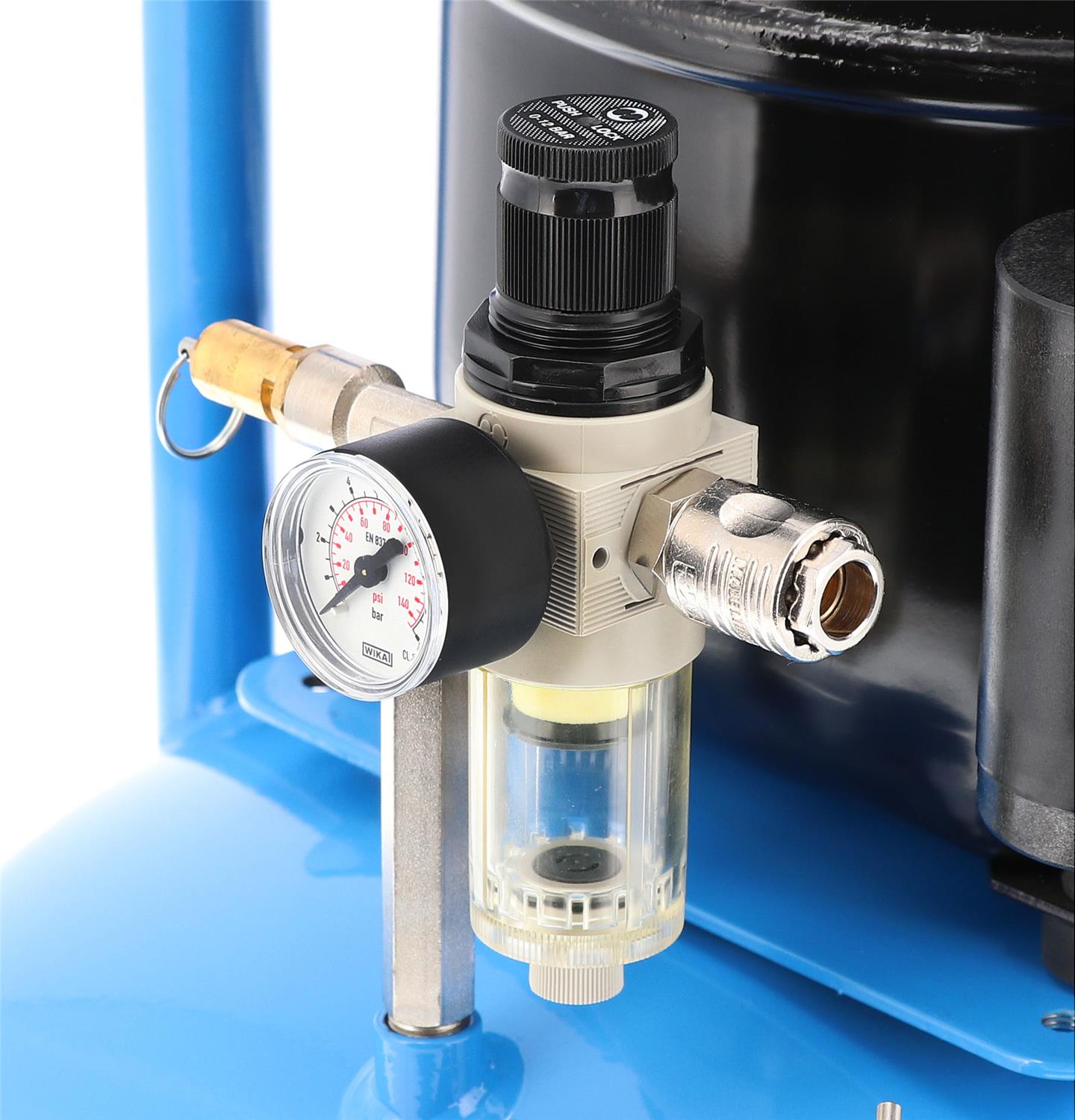 - Wyposażony w manometry, szybkozłącze pneumatyczne oraz filtroreduktor, który poprawia jakość powietrza oraz pozwala na pełną kontrolę ciśnienia dostarczanego do podłączonego urządzenia