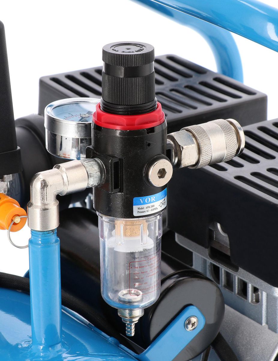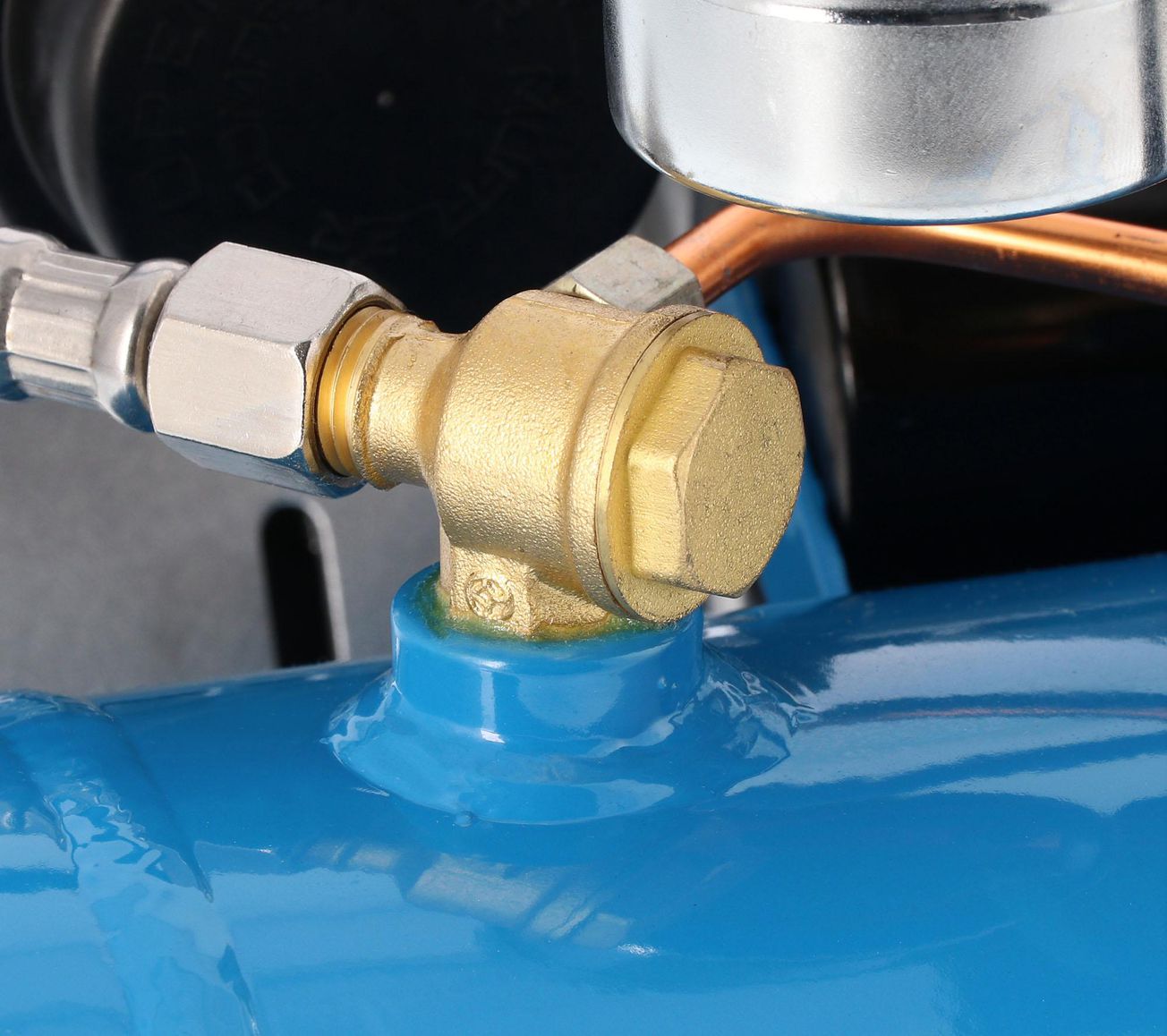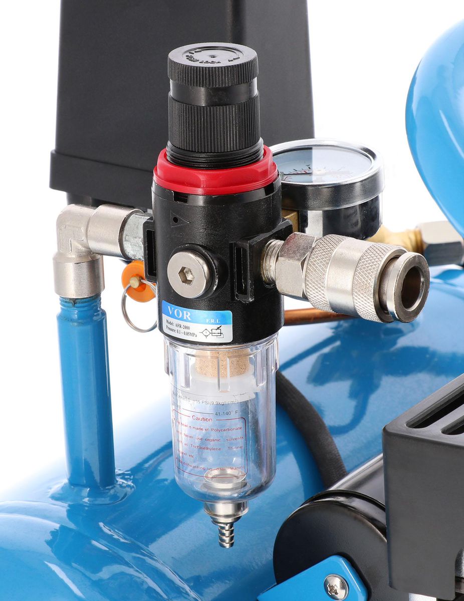 - Wyposażony w tłumik hałasu, manometry, szybkozłącze pneumatyczne oraz reduktor ciśnienia.