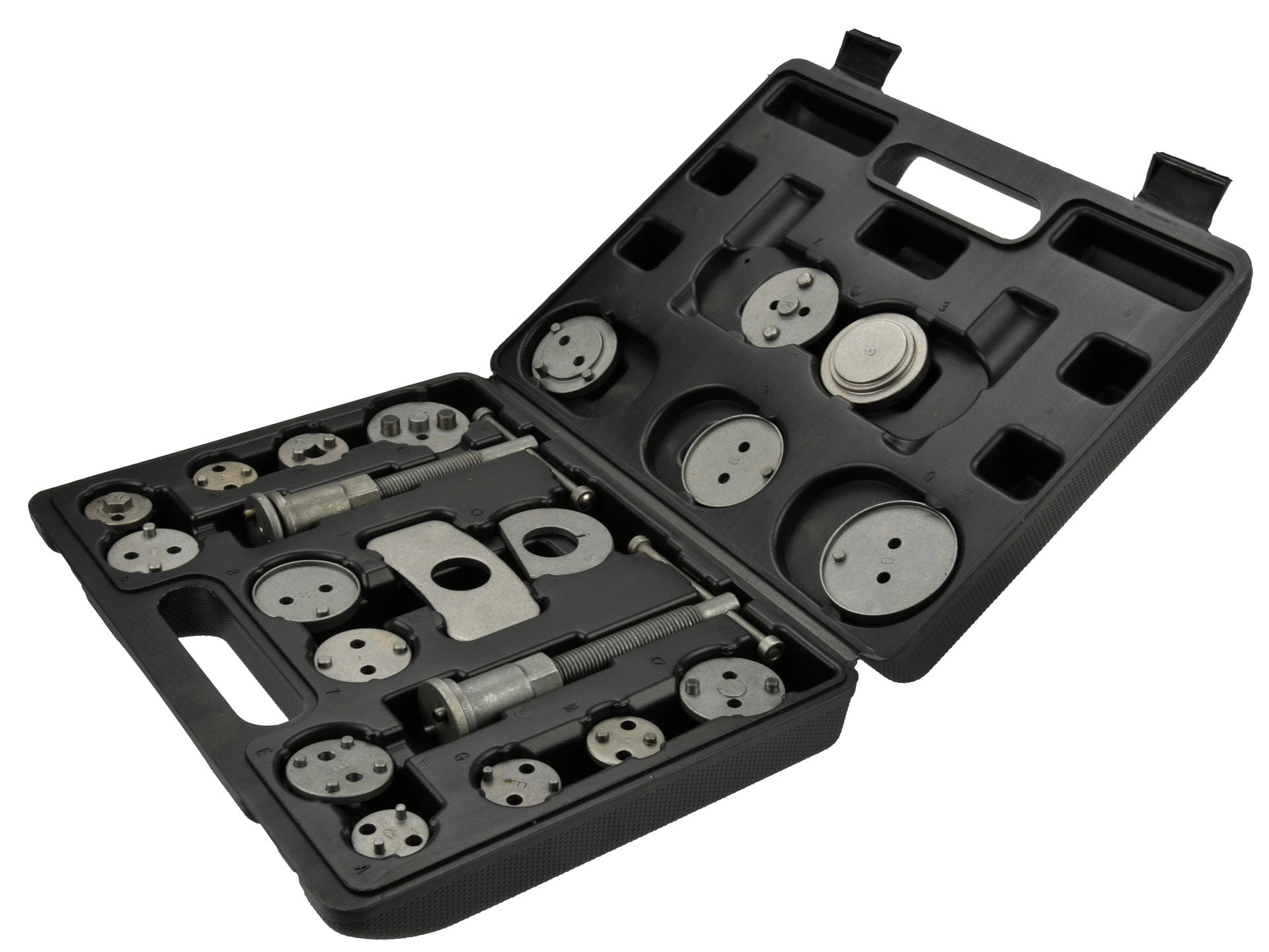 Profesjonalny zestaw do wyciskania tłoczków hamulcowych G02541 marki GEKO, 21-elementowy do cofania / wyciskania tłoczków hamulcowych, niezbędny przy naprawach pojazdów wyposażonych w hamulce tarczowe.