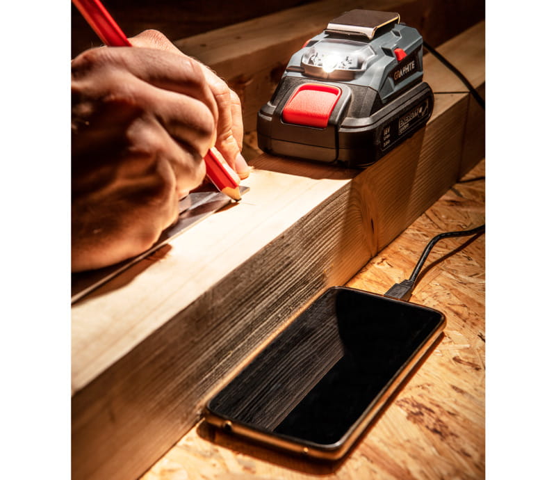 Mini latarka - ładowarka Energy+ GRAPHITE 58G025 współpracująca z akumulatorami 18V Li-Ion w systemie Energy+.