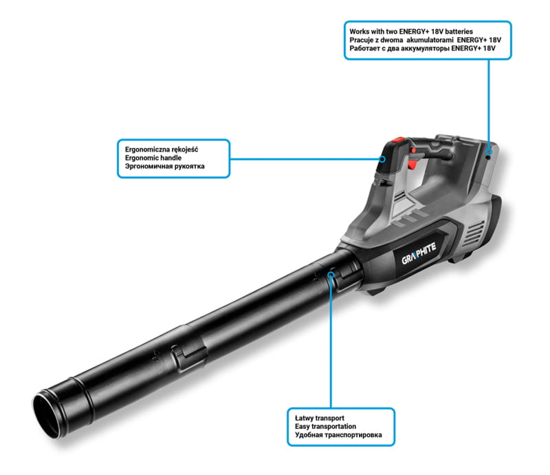 Dmuchawa do liści 36V GRAPHITE 58G044 współpracująca z akumulatorami 18V Li-Ion w systemie Energy+.