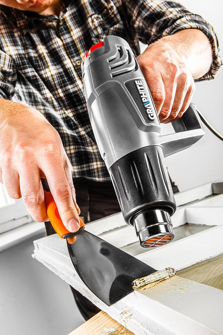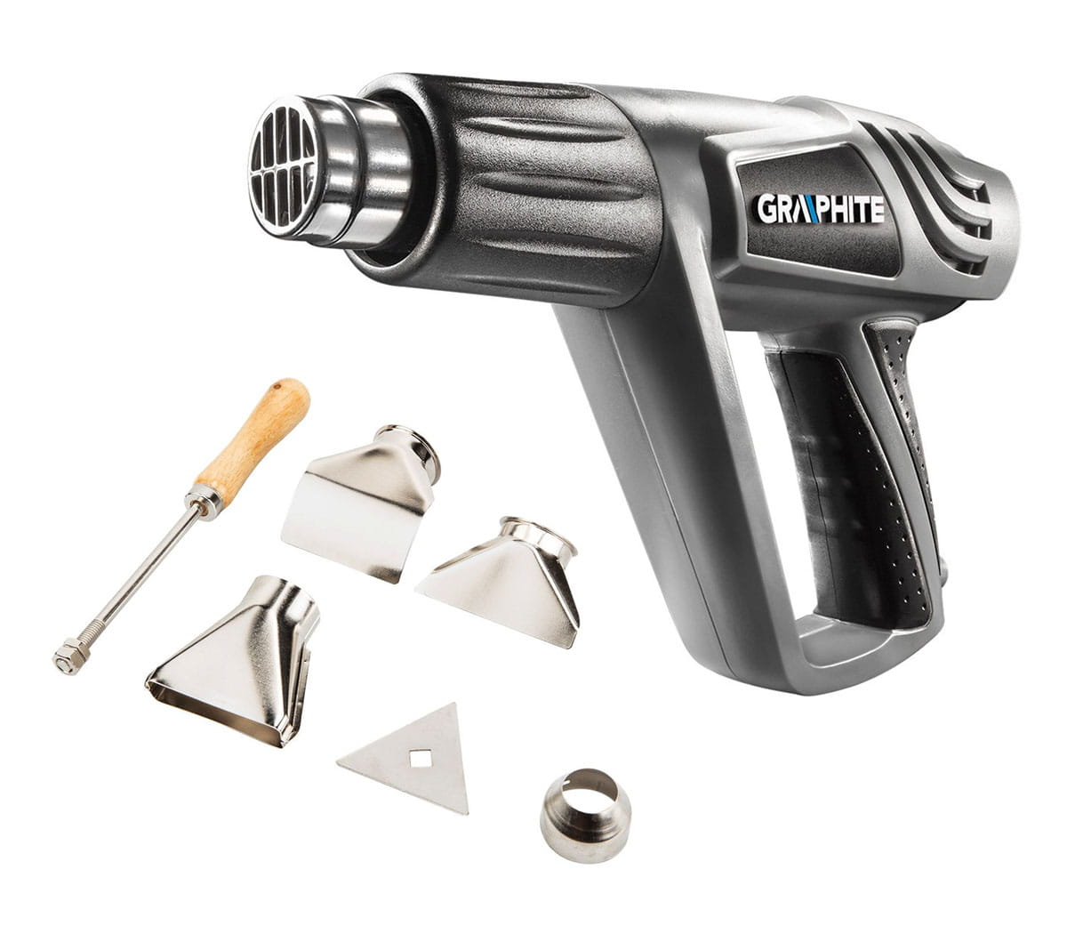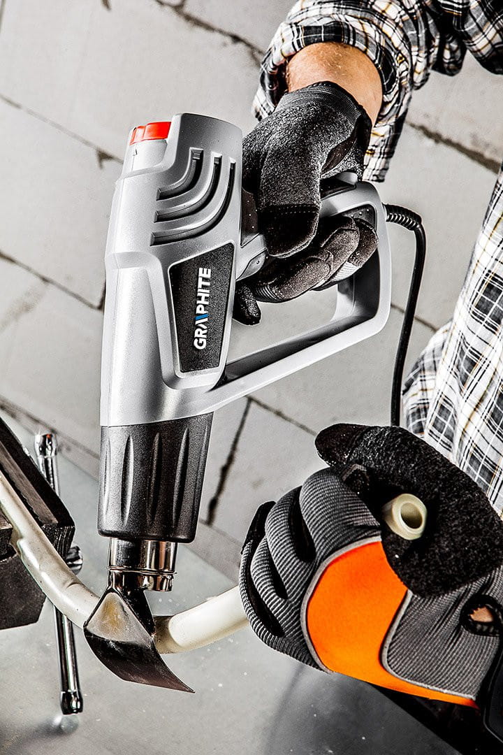 Opalarka 59G524 marki GRAPHITE to wysokiej klasy elektronarzędzie o dużej mocy 2000 W, którego konstrukcja umożliwia dobór odpowiednich parametrów temperatury i strumienia powietrza w zależności od rodzaju wykonywanej pracy poprzez wybór jednego z 3 zakresów oraz dodatkową płynną regulację temperatury.