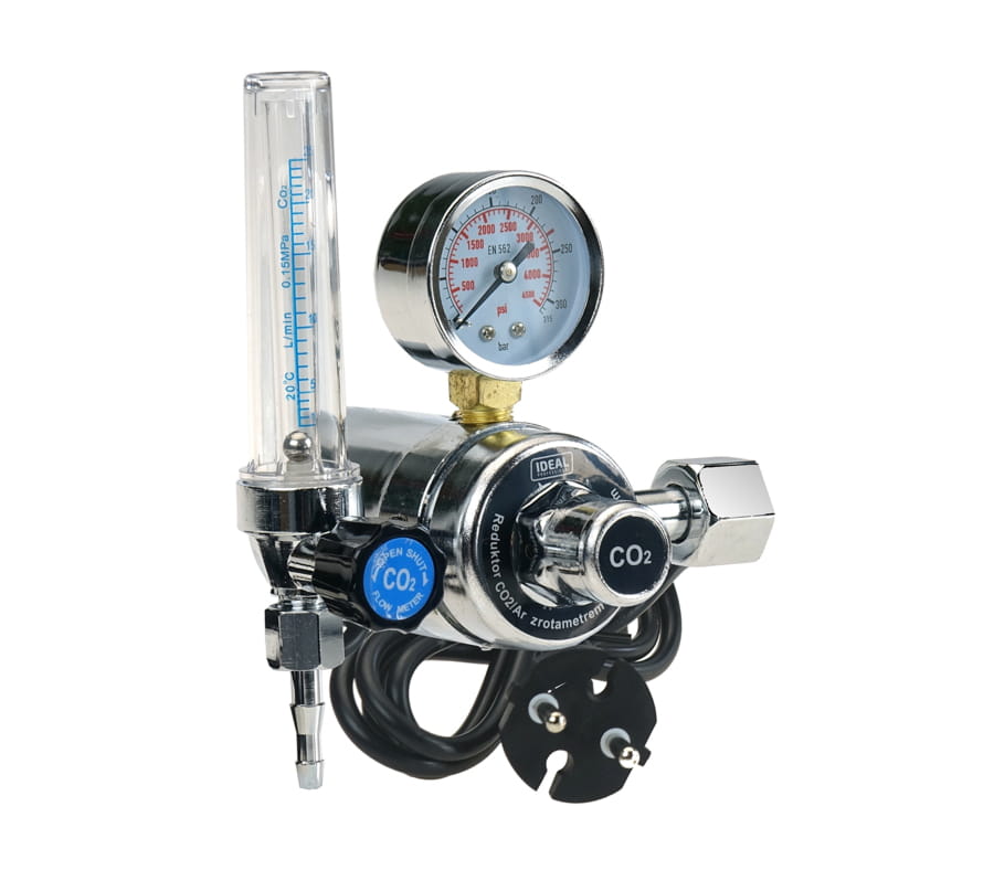 Reduktor CO2 / Argon z rotametrem i podgrzewaczem przeznaczony jest do obniżenia ciśnienia wylotowego gazu technicznego do wymaganego ciśnienia roboczego.