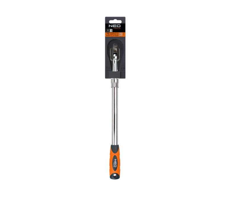 Pokrętło z przegubem marki NEO służy do napędu nasadek, a jednocześnie umożliwia działanie na nasadkę i śrubę z większym momentem obrotowym niż w tradycyjnej grzechotce, dzięki długiemu rozsuwanemu teleskopowo ramieniu pokrętła. Przegub umożliwia operowanie narzędziem pod różnym kątem. Funkcjonalne narzędzie przydatne w każdym warsztacie, oraz przy pracach serwisowych.