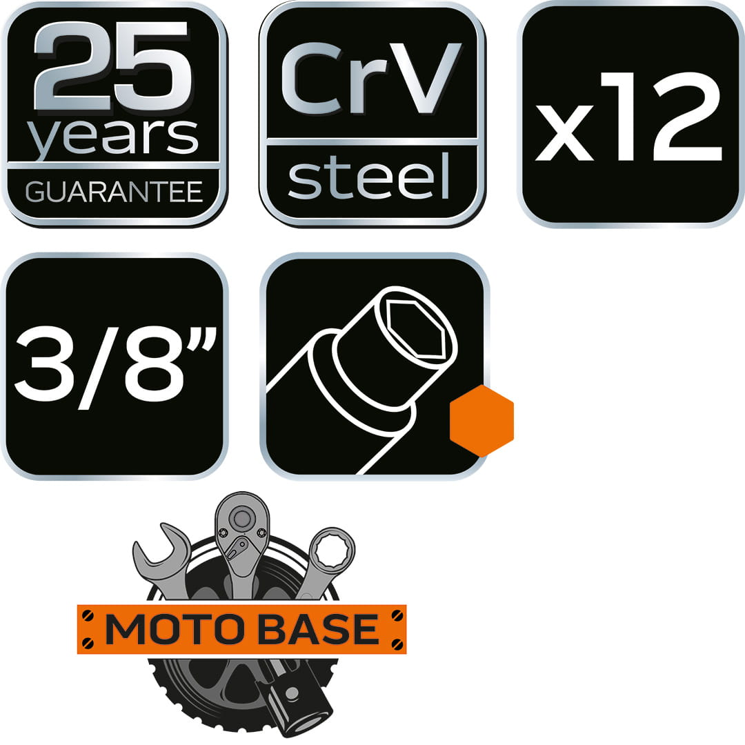 - nasadki 6-kątne krótkie 3/8": 8, 10, 12, 13, 14, 16, 17, 19, 21, 22 mm