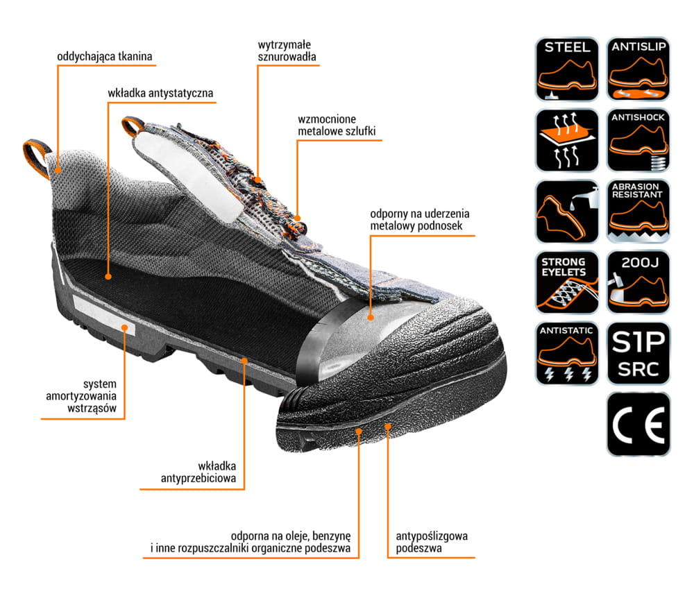 - metalowa wkładka antyprzebiciowa oraz wzmacniany metalowy podnosek chronią przed urazami mechanicznymi