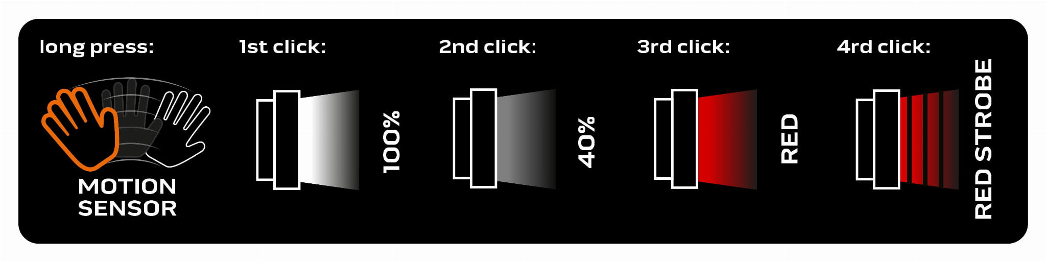 - posiada 4 funkcje świecenia: 100%, 40%, czerwone światło, migające czerwone światło